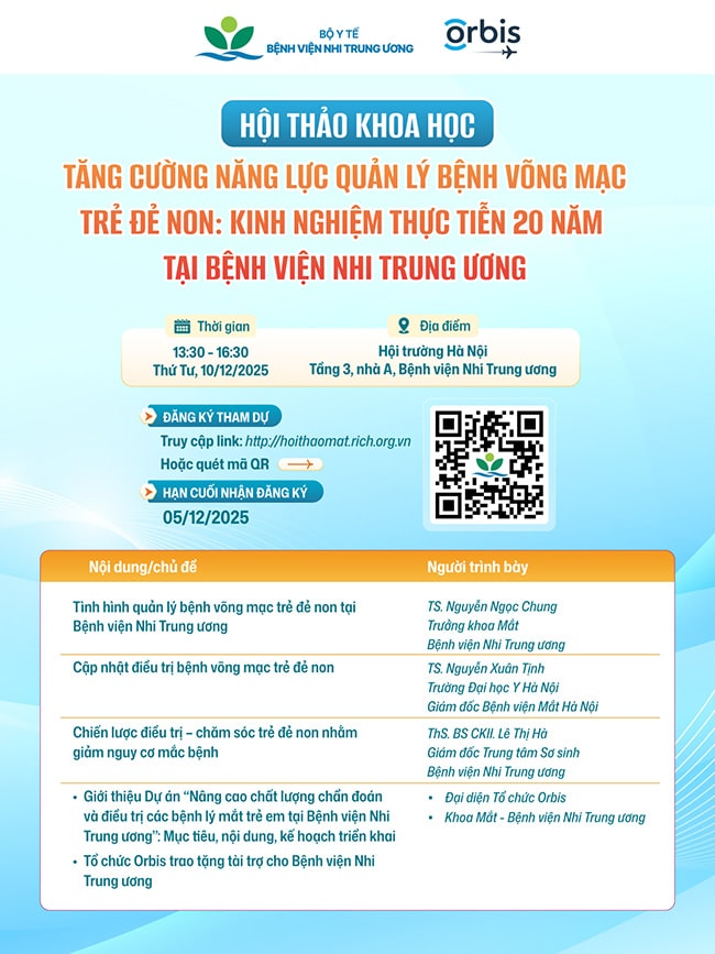 [Thông báo] Hội thảo khoa học: Tăng cường năng lực quản lý bệnh võng mạc trẻ đẻ non: Kinh nghiệm thực tiễn 20 năm tại Bệnh viện Nhi Trung ương